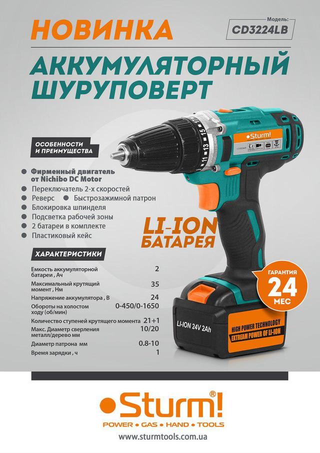 Шуруповерт аккумуляторный Sturm CD3224LB 24В (2 аккумулятора 2,0 А/ч + кейс)