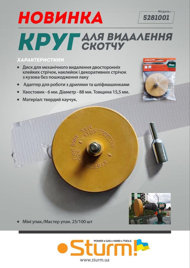 Sturm 5281001 – круг для удаления скотча. Диаметр – 88 мм. Толщина – 15,5 м. Изготовлен из твердого каучука. Прекрасно справляется с удалением двухсторонних клейких лент и наклеек с кузова автомобиля, предотвращая повреждение лакокрасочного покрытия. Для установки на шуруповерты и дрели в комплекте с кругом предусмотрен специальный адаптер. Максимально-допустимая частота вращения не более 1000 об / мин.