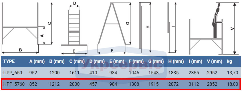 Поміст Elkop HPP 5760 - складна алюмінієва конструкція, яка може використовуватися як в якості помосту, так і приставної драбини або стрем'янки. Представлена модель складається з містка і двох опорних секцій на 7 сходинок кожна.